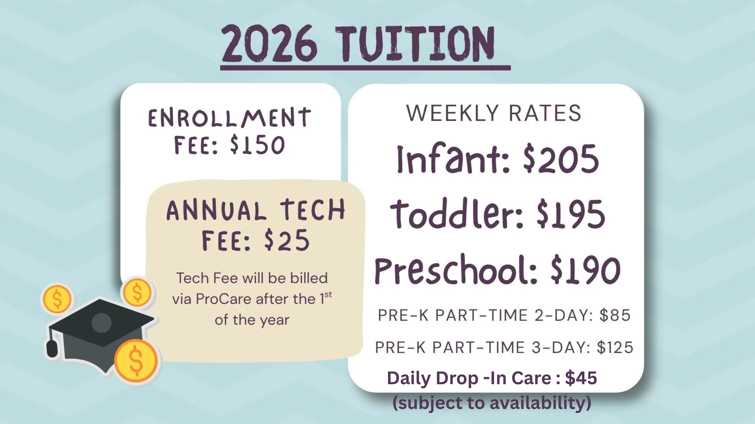 We are excited to offer Drop-in Care (subject to availability) at a rate of $45 per day.